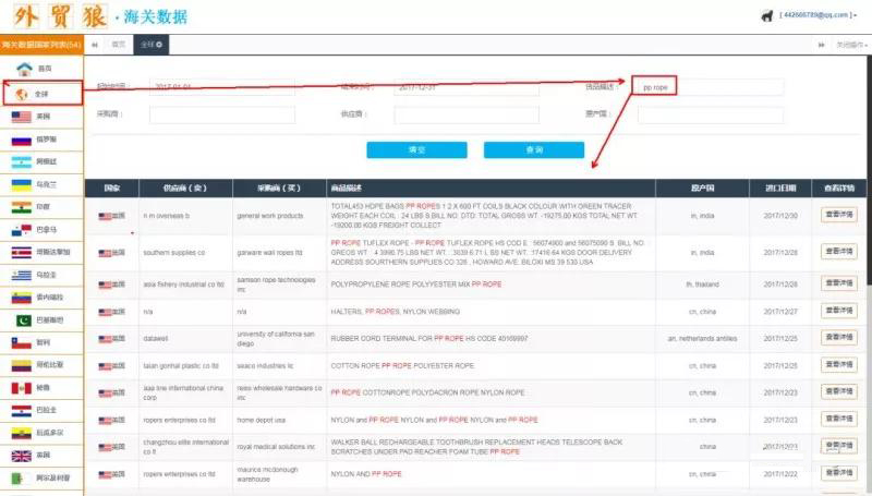 打開了海關(guān)數(shù)據(jù),這里共有52個國家+兩個地區(qū),共54個,選擇對應(yīng)國家或地區(qū)(PS:現(xiàn)在外貿(mào)狼升級了,可以直接一鍵查詢?nèi)虻目蛻簦┲?,可以用貨品描述搜索,也可以用采購商、供?yīng)商來直接搜索,建議用大詞,寬泛一些詞來搜,如下,我使用關(guān)鍵詞“pp rope”搜索客戶,如下: