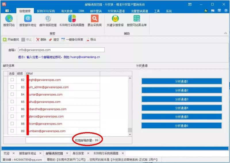 利用外貿(mào)狼的深度挖掘功能和搜索引擎爬蟲技術(shù),快速挖掘出企業(yè)的89個企業(yè)郵箱。