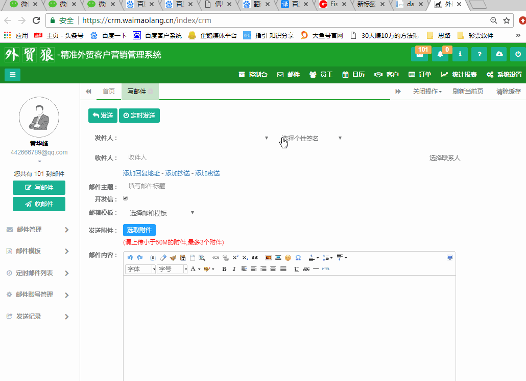 選擇“寫郵件”,自動勾選剛剛上傳的聯(lián)系人,然后選擇開發(fā)信模板,選擇簽名,即可輕松發(fā)送郵件!